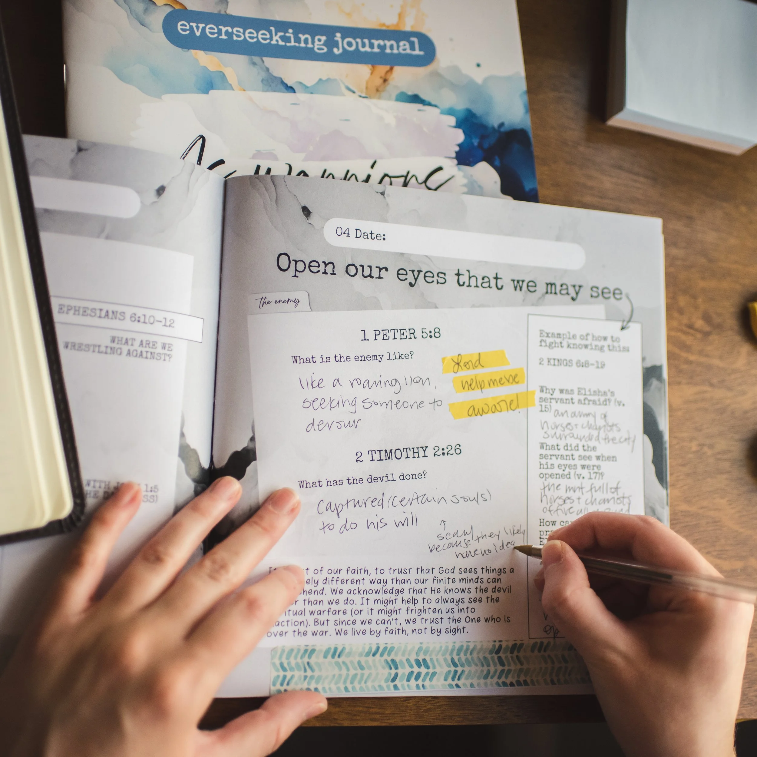“Everseeking is designed so that it can take as little time or as much time as needed. On days that I only have a couple minutes I sit down and simply read then answer the questions. The days I have more time I will sit down, read, answer the questions, highlight on the page, add decorations such as stickers and washi tape to make the page more colorful.”