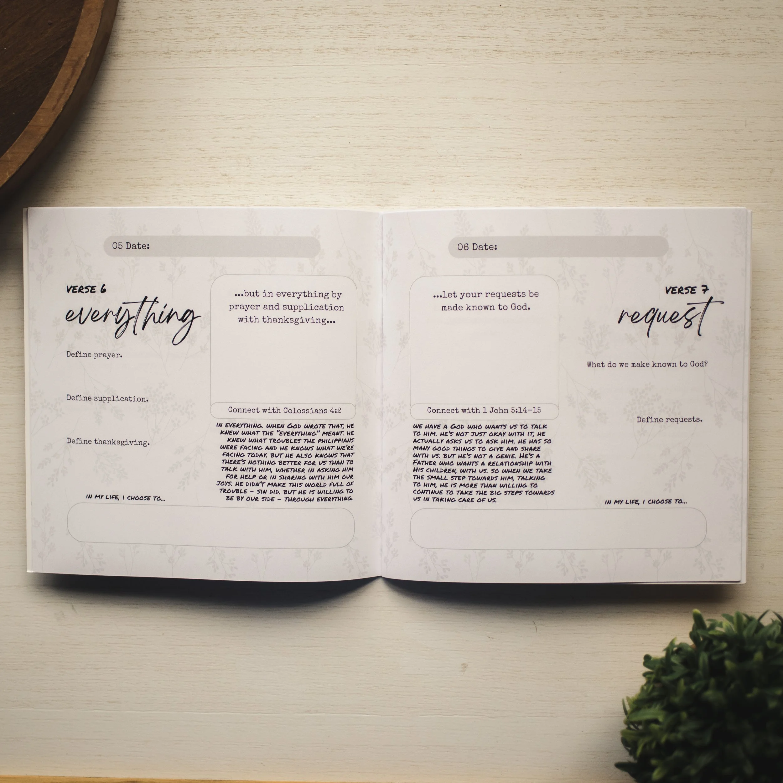 INSIDE: each page looks at a different word or phrase of Philippians 4:4-13 and how to make it part of our lives + thinking on the things it tells us to think on (what is lovely, true, honorable, etc)